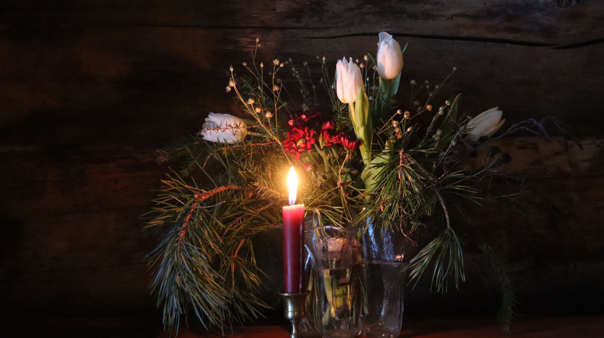 Joulukuun kimpuissa lähes kaikki käytetyistä kukista on tuontikukkia. Lisäksi hyödynnän luonnonmateriaaleja sekä viime kesänä lähellä kasvatettuja kuivakukkia.